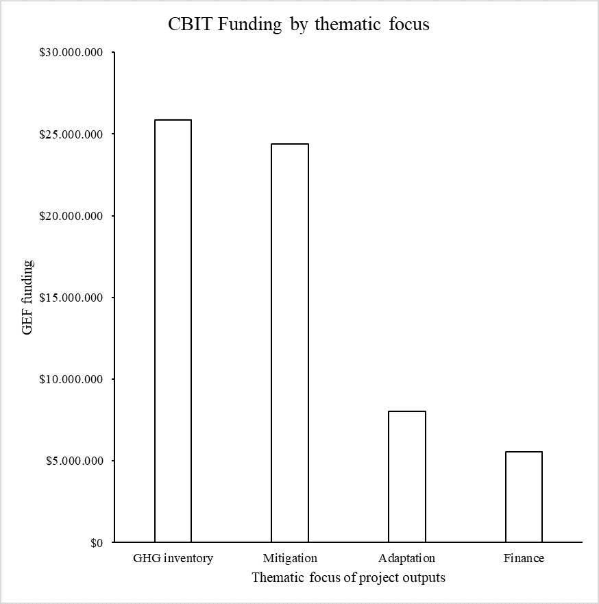 GEF’s annual CBIT update reports give some indication that mandatory reporting requirements are prioritized, but that adaptation and finance are also addressed. However, the GEF reports only give a macro and summary estimate and do not allow for disaggregation.