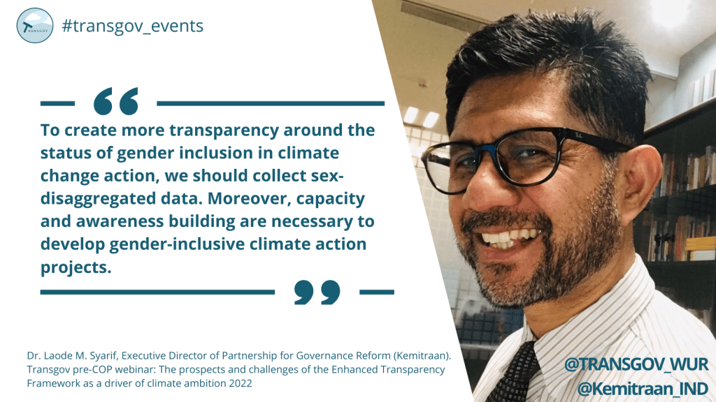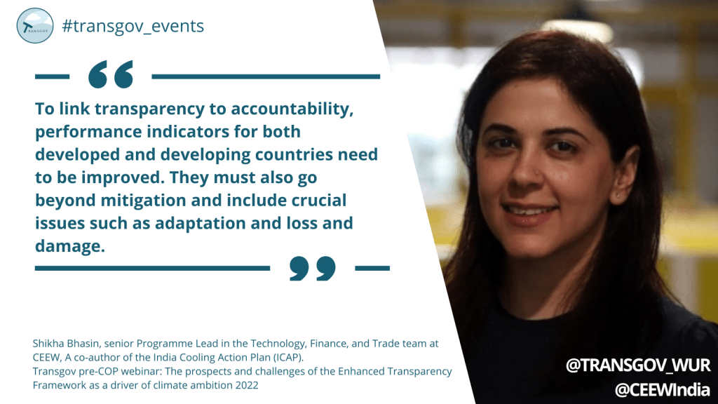 | 10:05 – 11:05 | Presentations (5 minute presentation + 5 minute Q&A) 1. Transparency and climate action: Prof. Aarti Gupta (WUR) 2. Transparency and the Global Stocktake: Mr. R. R. Rashmi (TERI) 3. Transparency and capacity building: Dr. Md. Masumur Rahman (SACEP) 4. Transparency and equity: Dr. Britta Rennkamp (UCT) 5. Transparency and accountability: Shikha Bhasin (CEEW) 6. Transparency and gender: Dr. Laode M. Syarif (The Partnership) |